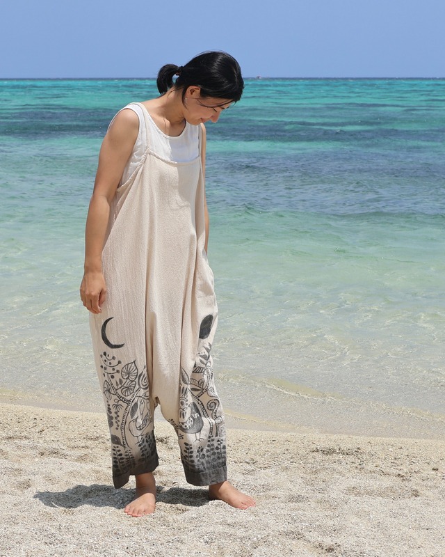 シンプルなサロペットにべんがら染めと手描きで植物と鳥をあしらいました。 ゆったりデザインで体型カバーに優れたサロペットです。 しっかりしたコットン素材で着心地が良く、年中活用できます。 また基本的にはボタン側がフロントですが、前後ろ逆に着ても楽しめます。 素材 オーガニックコットン100% size フリー 着丈126.5㎝ 胸囲110㎝ ウエスト129㎝ モデル 身長160㎝ 両サイドポケット付き 染めと絵付けはべんがら染料を使用しています。 【ベンガラとは 】 土から取れる成分(酸化鉄)で紅殻、弁柄とも呼ばれ語源はインドのベンガル地方より伝来したことからそう呼ばれています。日本の暮らしにも古くから根付いている素材で、陶器や漆器、また防虫、防腐の機能性から家屋のベンガラ塗りとしても使用されてきました。