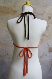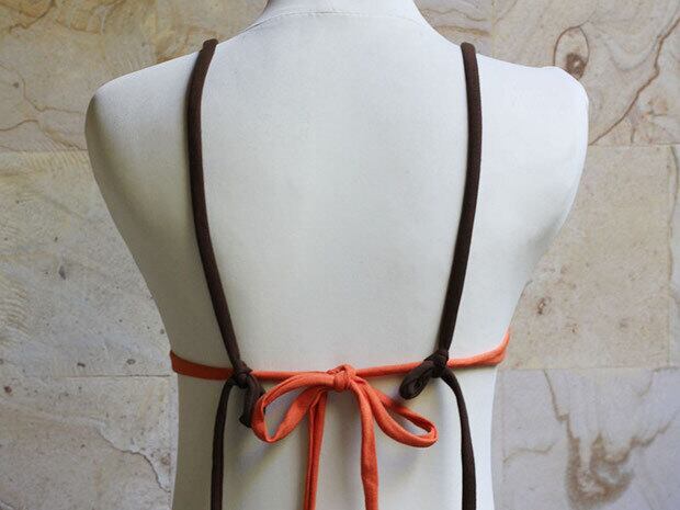 3. そのまま、通したそのひもを引っ張って本体をねじり、左右の肩ひもを首へ掛けて結びます(ホルタースタイルの場合)。