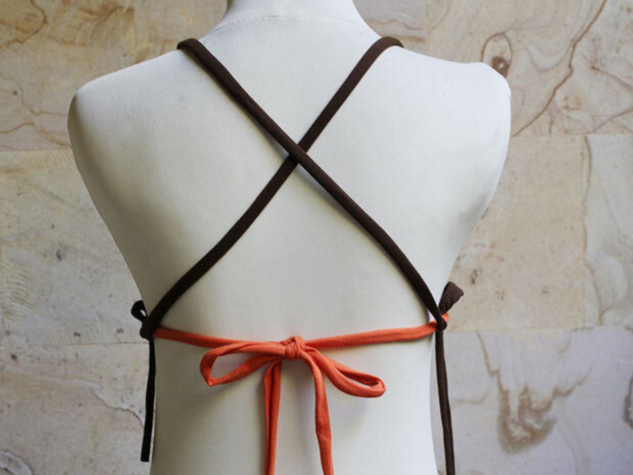 3. そのまま、通したそのひもを引っ張って本体をねじり、左右の肩ひもを首へ掛けて結びます(ホルタースタイルの場合)。