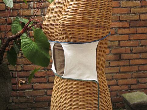 2 . 下へぶら下がったひもの片方(左右どちらでも良いです)を、体とブラ本体の間に通します。