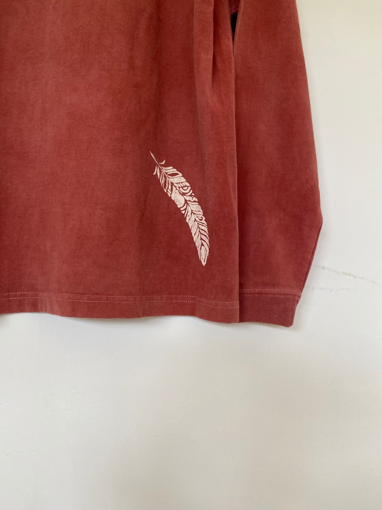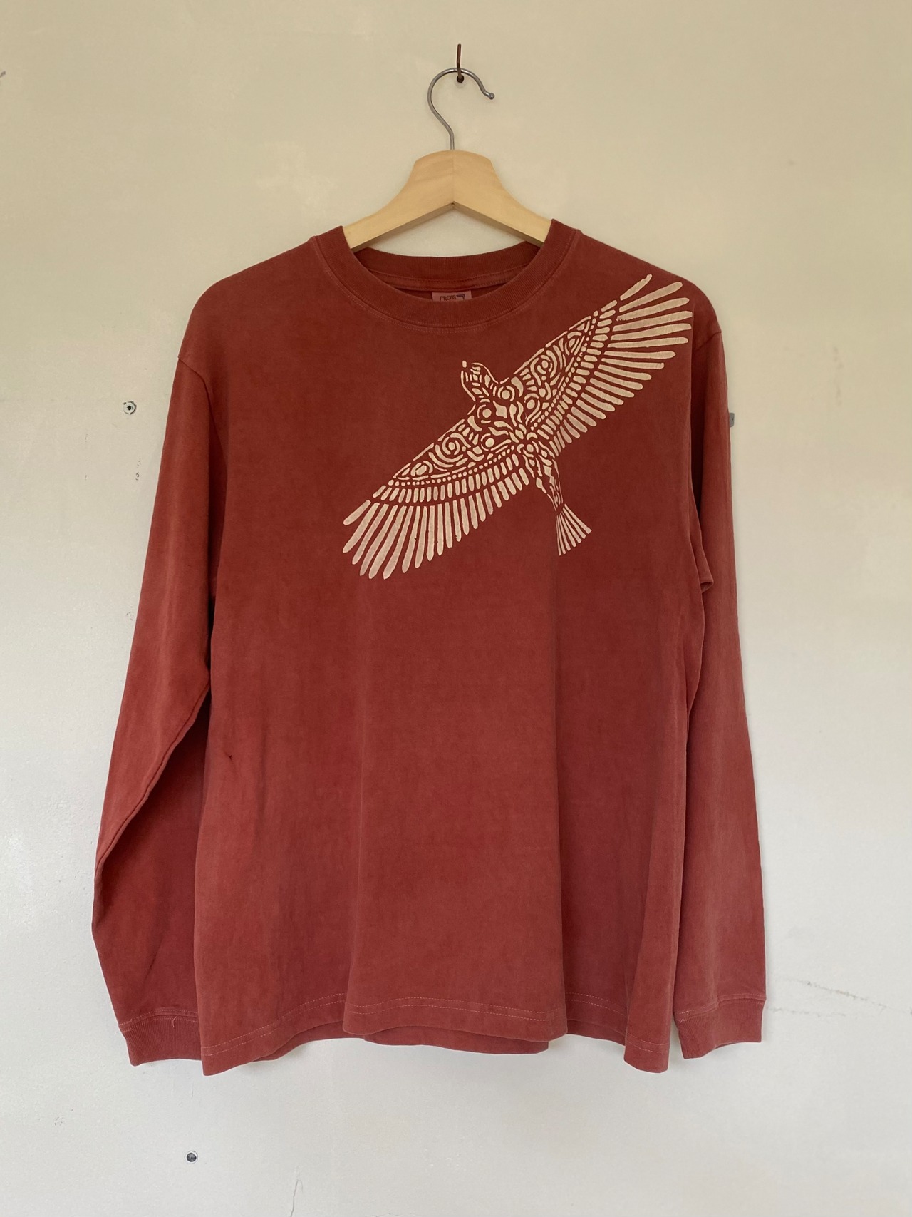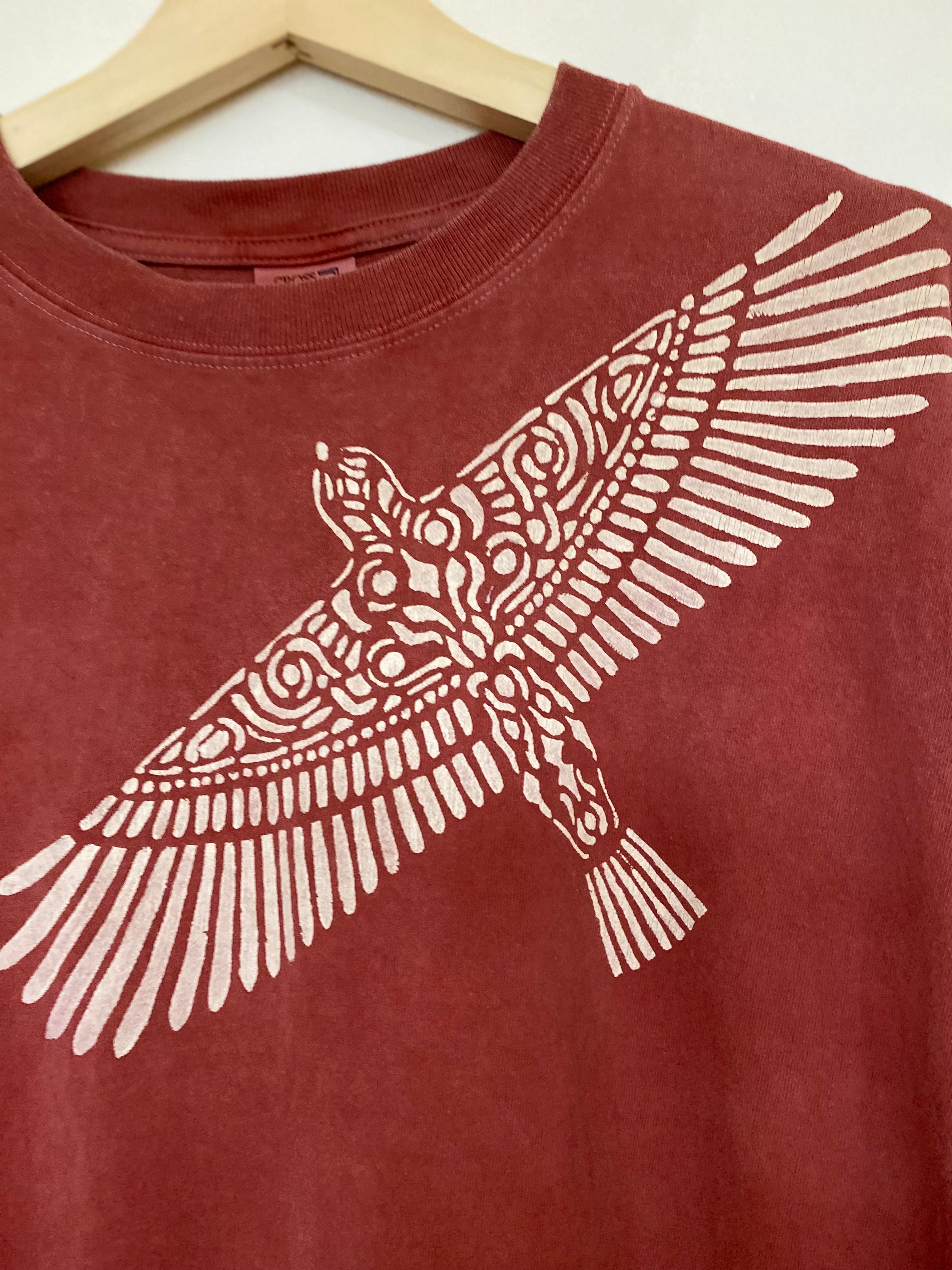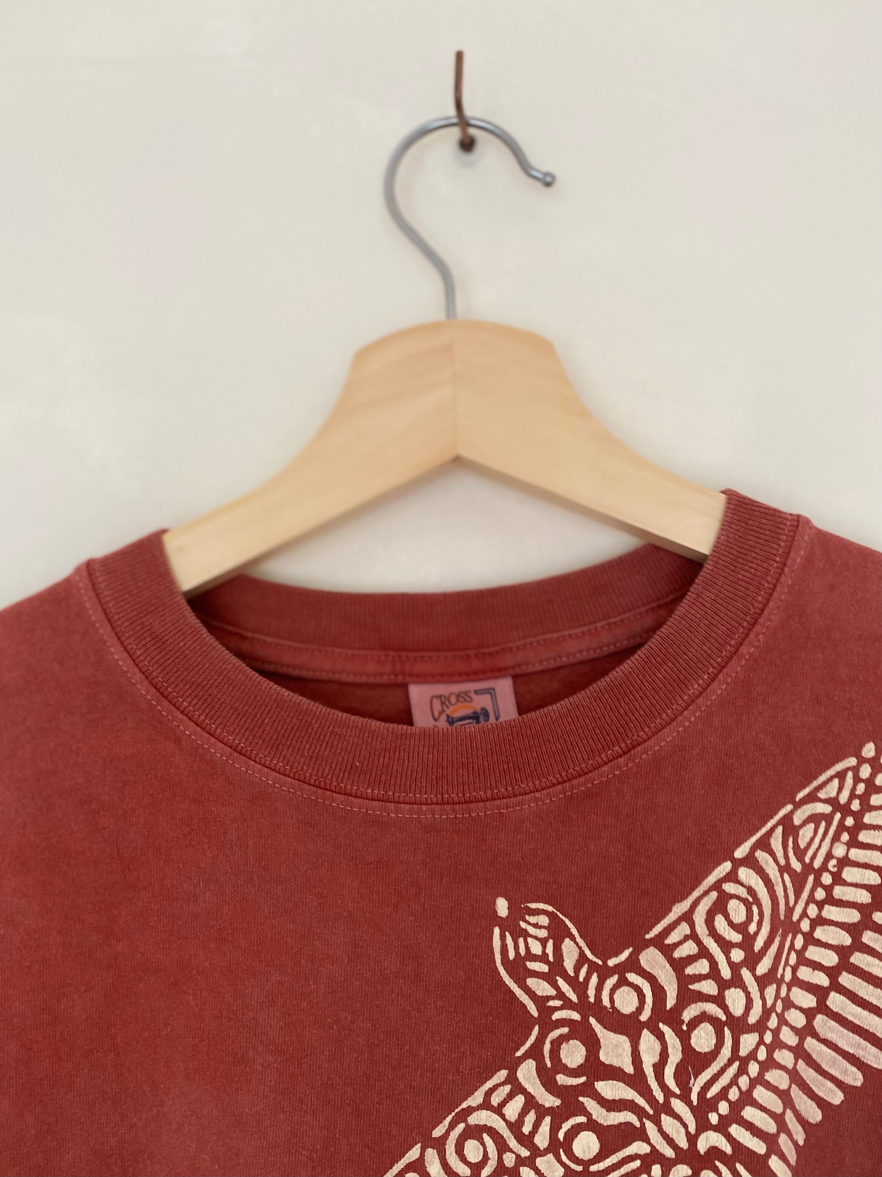 べんがらで染めたあとカンムリワシのデザインを型染めしました。