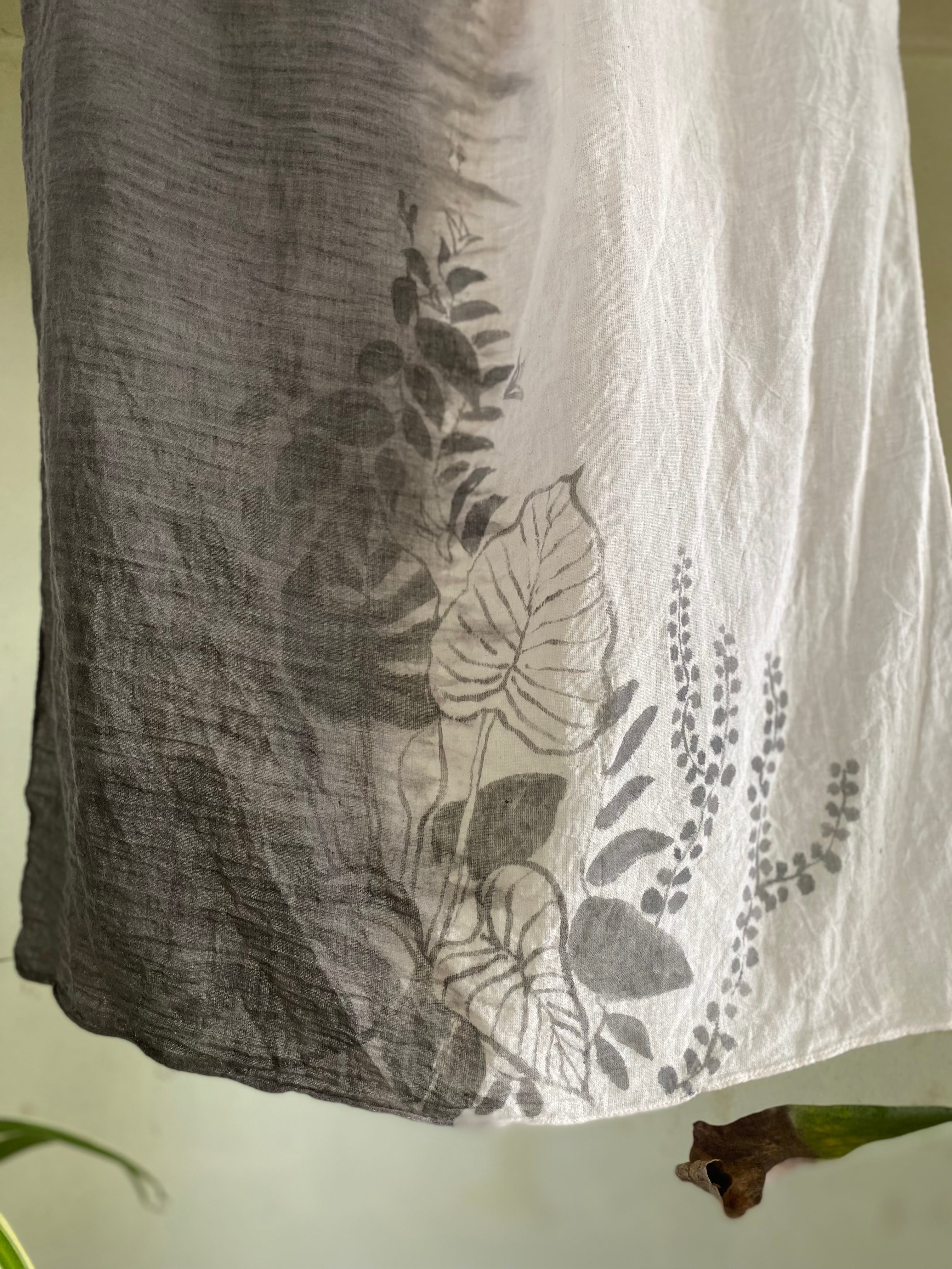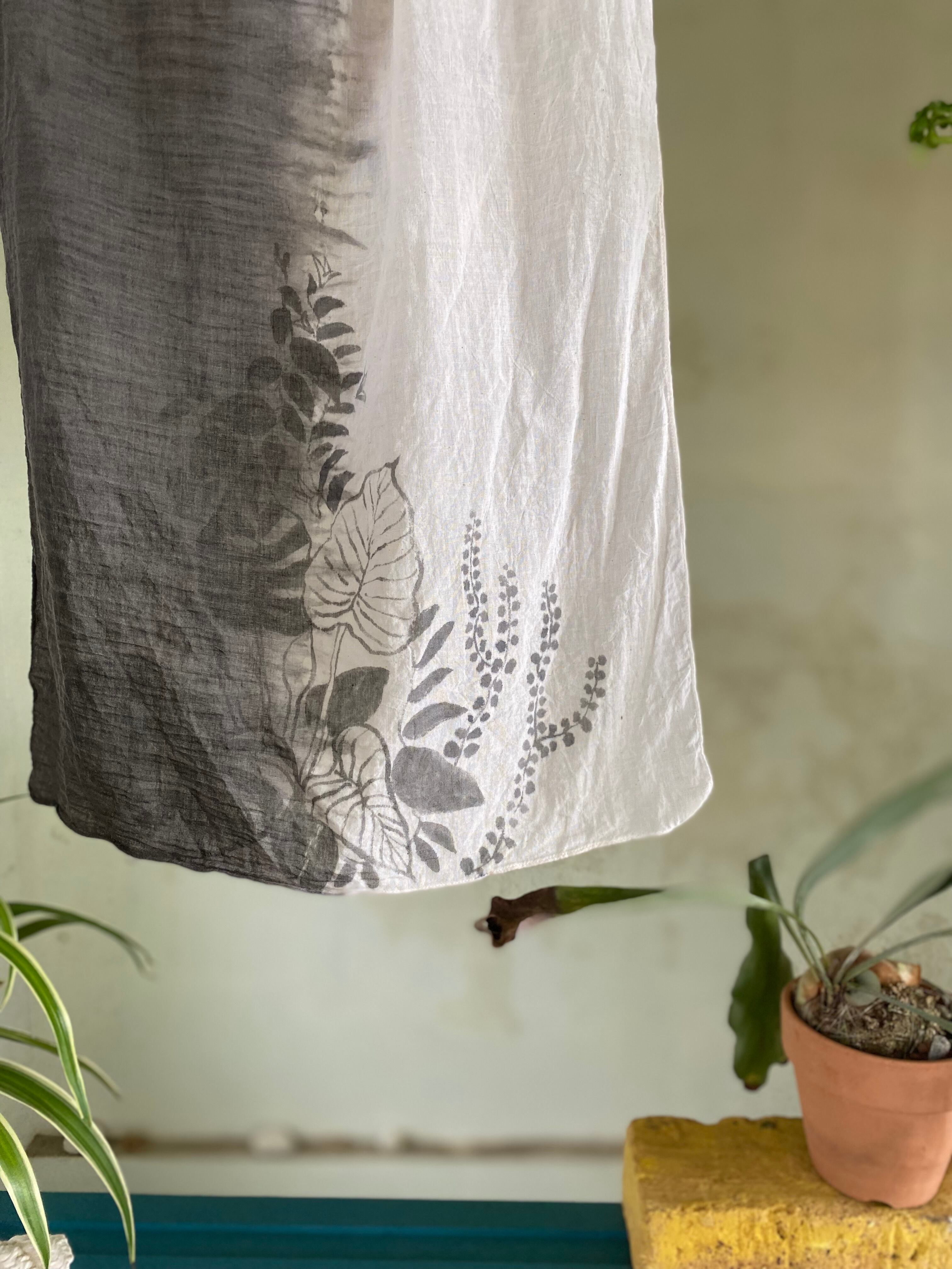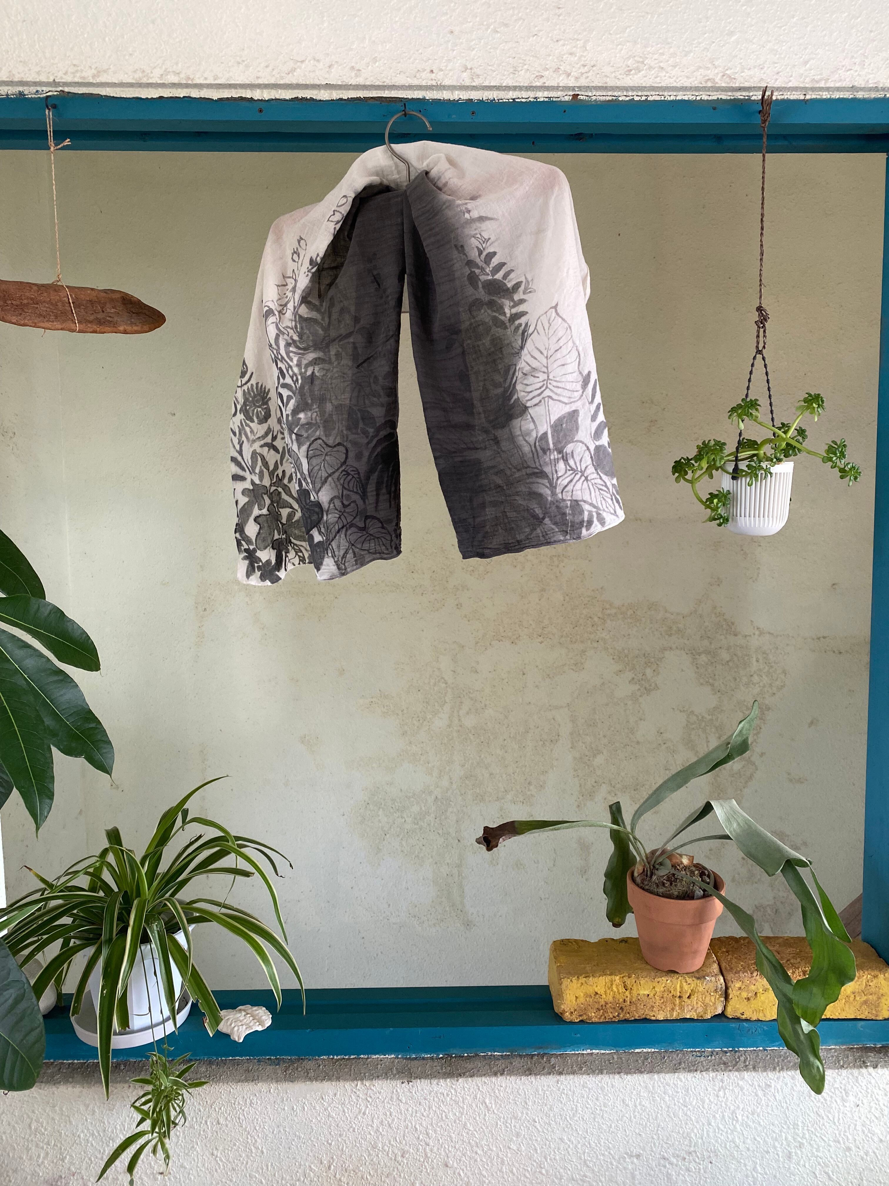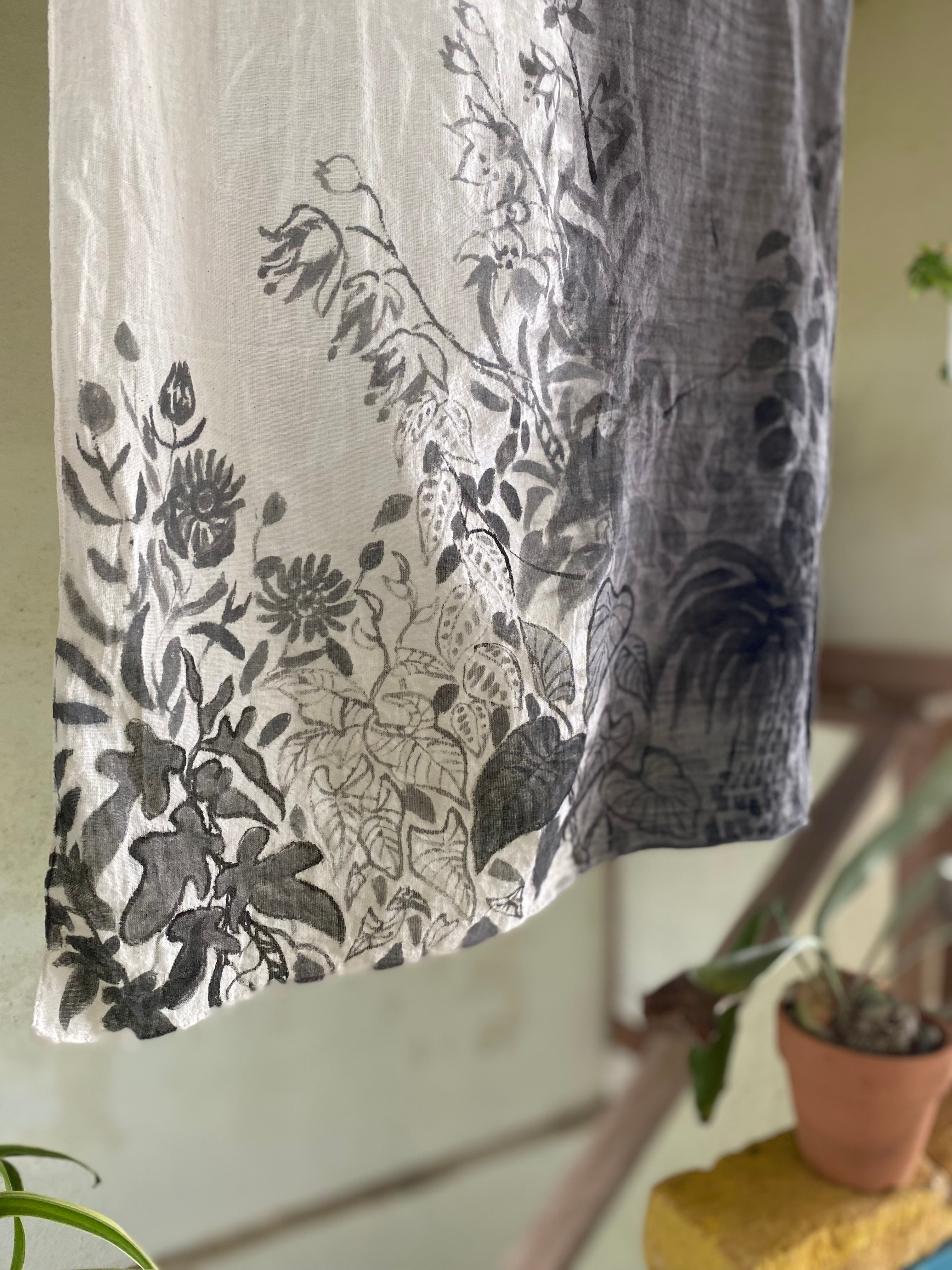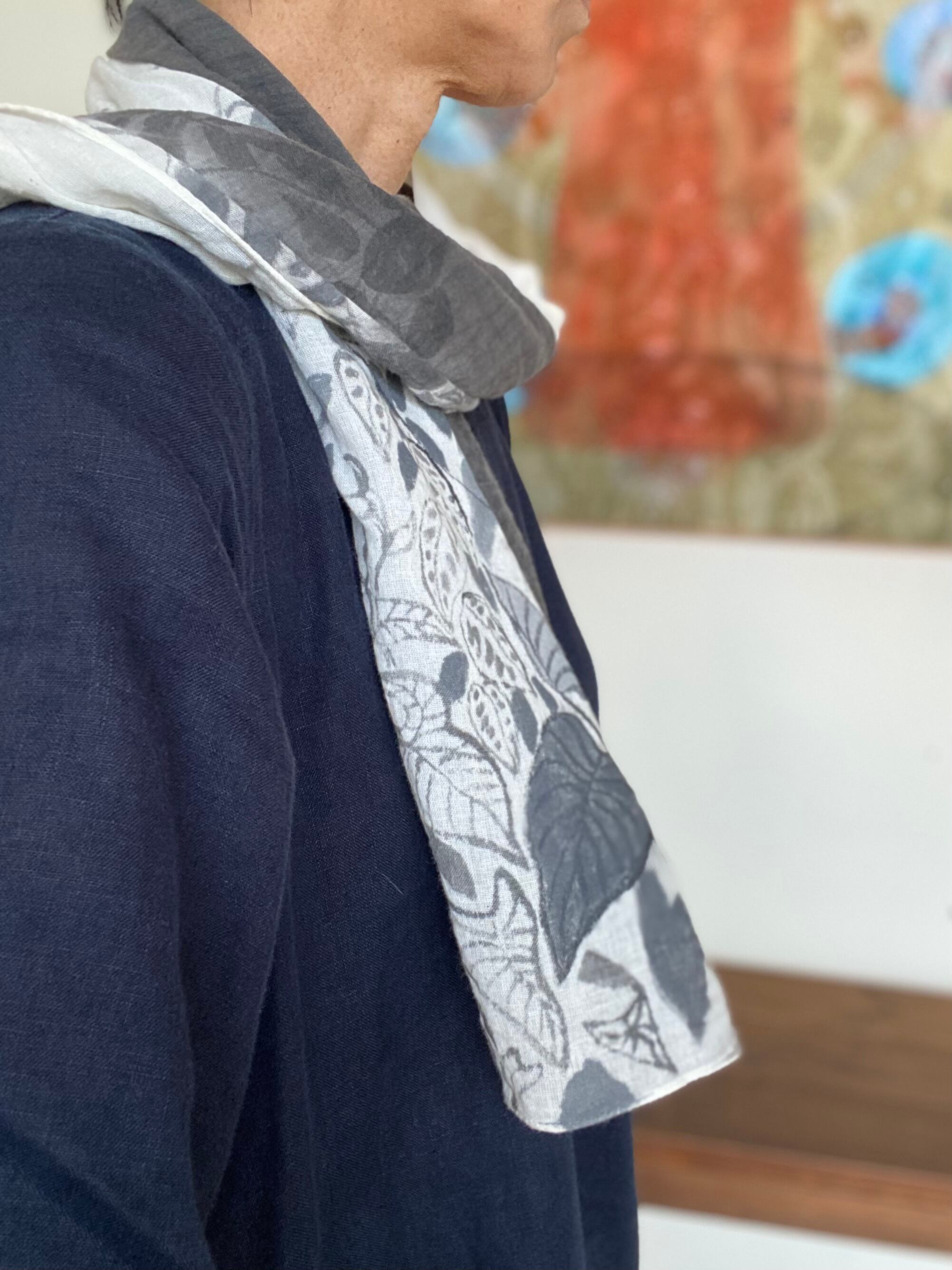 柔らかなコットンストールにべんがらで染めと絵付けをしました。